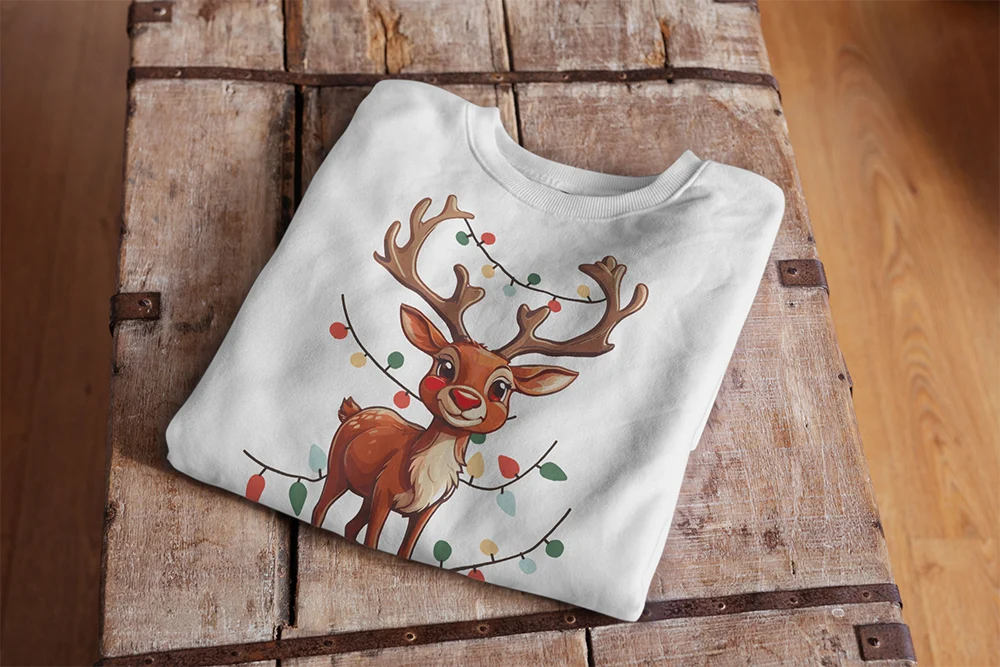 Bügelbild Weihnachts-Rentier – niedliches Wintermotiv mit roter Nase, Mütze & Schneeflocken Festlich, süß und voller Winterzauber. Dieses Bügelbild zeigt ein niedliches Rentier im Cartoon-Stil, das mit seiner roten Nase und einer roten Weihnachtsmütze sofort an die schönste Zeit des Jahres erinnert. Umgeben von zarten Schneeflocken strahlt es pure Freude und weihnachtliche Stimmung aus.Mit seinem freundlichen Blick und den ausgestreckten Pfoten wirkt das Rentier lebendig und charmant – perfekt für Kinder, Tierfreunde und alle, die die Adventszeit lieben. Ob auf Shirts, Hoodies oder Taschen – dieses Motiv bringt festliche Wärme und ein Lächeln in jedes Winter-Outfit.Das Bügelbild ist hochwertig gedruckt, lässt sich mühelos auf Baumwollstoffe wie Shirts, Sweater, Hoodies, Stofftaschen oder Kissenbezüge aufbringen und bleibt bei richtiger Pflege lange farbintensiv und formstabil. Ein langlebiger Textiltransfer, der Mode und Accessoires mit fröhlicher Weihnachtsstimmung bereichert.Du willst noch mehr Bügelbilder mit winterlichen und weihnachtlichen Motiven entdecken? Dann wirf einen Blick auf unsere Winter-Kollektion – und finde dein nächstes Lieblingsmotiv!