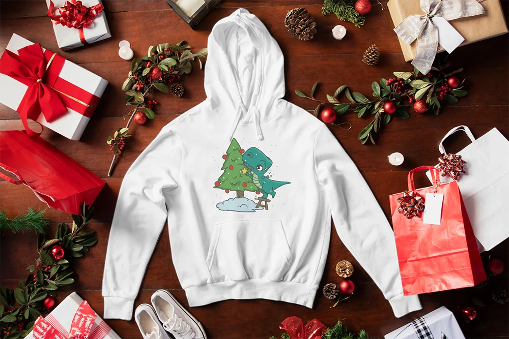 Bügelbild Dino schmückt Weihnachtsbaum – lustiges XMAS-Motiv Ein Weihnachtsfest voller Dino-Magie. Dieses Bügelbild zeigt einen fröhlichen Dinosaurier, der mit viel Spaß einen Weihnachtsbaum schmückt. Bunte Kugeln, Lichterketten und die verspielte Dino-Optik machen das Motiv zu einem echten Highlight für Kinder. Ein originelles Design, das Weihnachten für kleine Dino-Fans noch schöner macht.Perfekt für Kinderkleidung zu Weihnachten, sei es als festliches Shirt, gemütlicher Hoodie oder süße Stofftasche für Geschenke. Dieses Motiv bringt die Lieblings-Dinos direkt ins Weihnachtsoutfit und sorgt garantiert für strahlende Kinderaugen. Ideal auch als DIY-Idee für Eltern, Großeltern oder alle, die dinobegeisterte Kids mit etwas Besonderem überraschen möchten.Das Bügelbild ist hochwertig gedruckt, lässt sich ganz einfach auf Baumwollstoffe wie Shirts, Sweater, Hoodies, Stofftaschen oder Kissenbezüge aufbringen und bleibt bei richtiger Pflege lange farbintensiv und formstabil. So wird jedes Kleidungsstück zu einem festlichen Unikat für Kinder, die Dinos lieben.Du willst noch mehr Bügelbilder mit Dinosauriern entdecken? Dann wirf einen Blick auf unsere Dino-Kollektion – und finde dein nächstes Lieblingsmotiv!