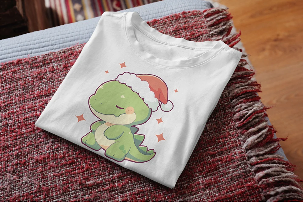 Bügelbild Kawaii-Dino mit Weihnachtsmütze – süßes XMAS-Motiv Süßer Urzeitfreund im Weihnachtslook. Dieses Bügelbild zeigt einen kleinen Dino im Kawaii-Stil, der fröhlich eine rote Weihnachtsmütze trägt. Mit dem verträumten Blick, den runden Formen und dem niedlichen Ausdruck bringt er sofort gute Laune und eine Extraportion Weihnachtsstimmung aufs Textil. Ein Motiv, das Kinder und Dino-Fans gleichermaßen begeistert.Ob als Highlight auf Kinderkleidung, als festlicher Akzent auf Hoodies oder als witziges Detail auf Stofftaschen – der Kawaii-Dino ist perfekt für Weihnachtsoutfits mit Spaßfaktor. Er eignet sich ideal als DIY-Idee für Eltern, die ihren Kids etwas Besonderes basteln wollen, oder als Geschenk für alle, die niedliche Dinosaurier lieben.Das Bügelbild ist hochwertig gedruckt, lässt sich ganz einfach auf Baumwollstoffe wie Shirts, Sweater, Hoodies, Stofftaschen oder Kissenbezüge aufbringen und bleibt bei richtiger Pflege lange farbintensiv und formstabil. Ein langlebiger Textiltransfer, der jedes Outfit zu einem fröhlichen, weihnachtlichen Hingucker macht.Du willst noch mehr Bügelbilder mit Dinosauriern entdecken? Dann wirf einen Blick auf unsere Dino-Kollektion – und finde dein nächstes Lieblingsmotiv!