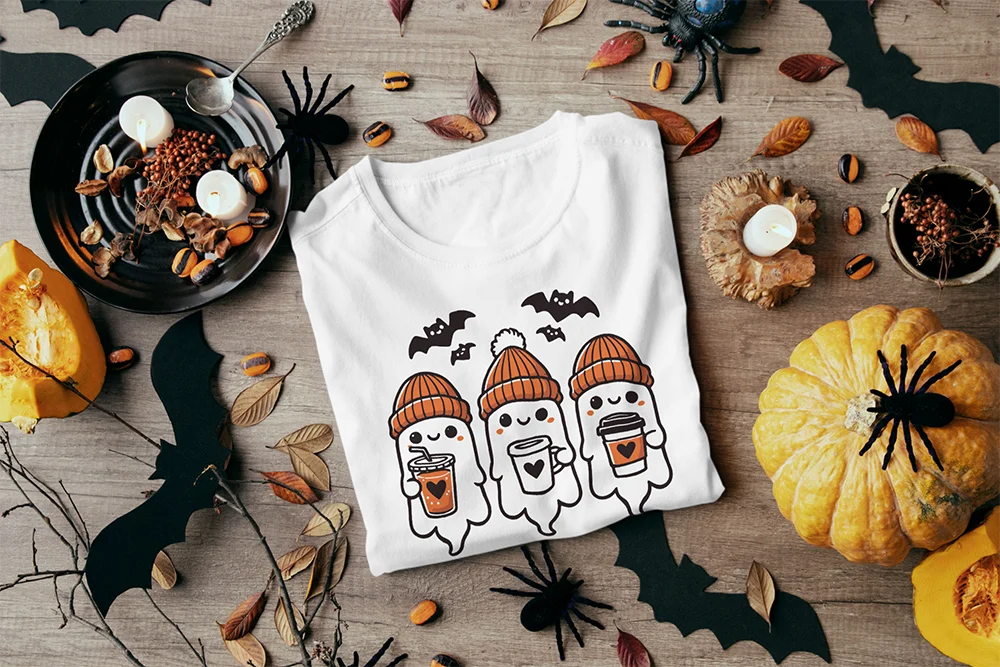 Bügelbild süßes Gespenst mit Hexenhut & Kürbis – niedliches Halloween-Motiv mit Fledermäusen & Sternen Süß, verspielt und voller Halloween-Charme. Dieses Bügelbild zeigt ein fröhliches kleines Gespenst mit glänzenden Augen und rosa Bäckchen. Auf seinem Kopf sitzt ein schwarzer Hexenhut mit orangefarbenem Band, goldener Schnalle und herbstlicher Deko aus Beeren und Blättern. In den Händen trägt es einen grinsenden Halloween-Kürbis und eine kleine Laterne in Kürbisform.Eine kleine Fledermaus flattert über der Szene und macht das Design komplett. Das Motiv kombiniert typische Halloween-Symbole mit einem niedlichen Look – perfekt für Kinder, Teenager und Erwachsene, die Spuk lieber süß als gruselig mögen. Ob auf Shirts, Hoodies oder Taschen – dieses Gespenst bringt Spaß und Herbststimmung in jedes Outfit.Das Bügelbild ist hochwertig gedruckt, lässt sich einfach auf Baumwollstoffe wie Shirts, Sweater, Hoodies, Stofftaschen oder Kissenbezüge aufbringen und bleibt bei richtiger Pflege lange farbintensiv und formstabil. Ein langlebiger Textiltransfer, der deine Kleidung oder Accessoires in ein liebenswertes Halloween-Highlight verwandelt.Du willst noch mehr Bügelbilder mit Monstern, Vampiren und dem Hauch von Apokalypse entdecken? Dann wirf einen Blick auf unsere Horror-Kollektion – und finde dein nächstes Lieblingsmotiv!