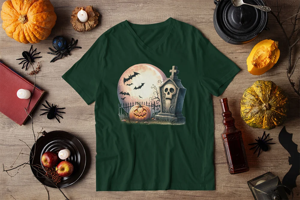 Bügelbild gruseliger Halloween-Friedhof – düsteres Motiv mit Grabsteinen, Fledermäusen & Vollmond Düster, geheimnisvoll und voller Halloween-Flair. Dieses Bügelbild zeigt einen schaurigen Friedhof mit alten Grabsteinen, über dem Fledermäuse im Licht des Vollmonds ihre Kreise ziehen. Die dunkle Szenerie fängt die perfekte Gruselstimmung ein – unheimlich, aber auch stilvoll. Ein klassisches Halloween-Motiv für alle, die es schaurig mögen.Ob als gruseliger Eyecatcher auf Shirts, als düsterer Akzent auf Hoodies oder als unheimliches Detail auf Taschen – der Halloween-Friedhof ist ideal für Partys, Kostüm-Outfits und DIY-Projekte. Mit Fledermäusen, Vollmond und Grabsteinen wird die unvergessliche Atmosphäre einer Geisternacht lebendig – perfekt für Gruselfans.Das Bügelbild ist hochwertig gedruckt, einfach auf Baumwollstoffe wie Shirts, Sweater, Hoodies, Stofftaschen oder Kissenbezüge aufzubringen und bleibt bei richtiger Pflege lange farbintensiv und formstabil. Ein langlebiger Textiltransfer, der deine Kleidung oder Accessoires in ein düsteres Halloween-Statement verwandelt.Du willst noch mehr Bügelbilder mit Hexen, Vampiren und dem Hauch von Apokalypse entdecken? Dann wirf einen Blick auf unsere Horror-Kollektion – und finde dein nächstes Lieblingsmotiv!
