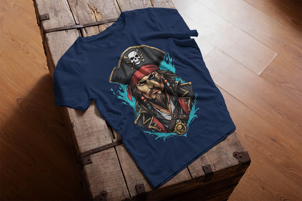 Bügelbild Piraten-Porträt – detailreiches Seeräuber-Motiv mit Totenkopf-Hut & Abenteuer-Flair Wild, grimmig und voller Abenteuerlust. Dieses Bügelbild zeigt das Porträt eines Piraten mit markantem Gesichtsausdruck, schwarzem Dreispitz-Hut samt Totenkopf-Emblem und rotem Stirnband. Auffällige Schmuckstücke wie Ohrringe und eine Kette mit Totenschädel-Anhänger sowie sein langer Bart verleihen ihm den unverwechselbaren Seeräuber-Look.Goldene Details an der Kleidung und dynamische blaue Farb-Elemente im Hintergrund lassen das Motiv wirken, als käme der Pirat direkt aus einer wilden Seeschlacht. Perfekt für Fans von Seefahrt, Abenteuern und klassischem Piraten-Design. Ob als Eyecatcher auf Shirts, als markantes Detail auf Hoodies oder als Highlight auf Taschen – dieser Pirat sorgt für echtes Seeräuber-Flair.Das Bügelbild ist hochwertig gedruckt, lässt sich problemlos auf Baumwollstoffe wie Shirts, Sweater, Hoodies, Stofftaschen oder Kissenbezüge aufbringen und bleibt bei richtiger Pflege lange farbintensiv und formstabil. Ein langlebiger Textiltransfer, der jedes Outfit in ein Abenteuer auf hoher See verwandelt.Du willst noch mehr Bügelbilder entdecken für die nächste Seefahrt? Dann wirf einen Blick auf unsere Meer-Kollektion – und finde dein nächstes Lieblingsmotiv!