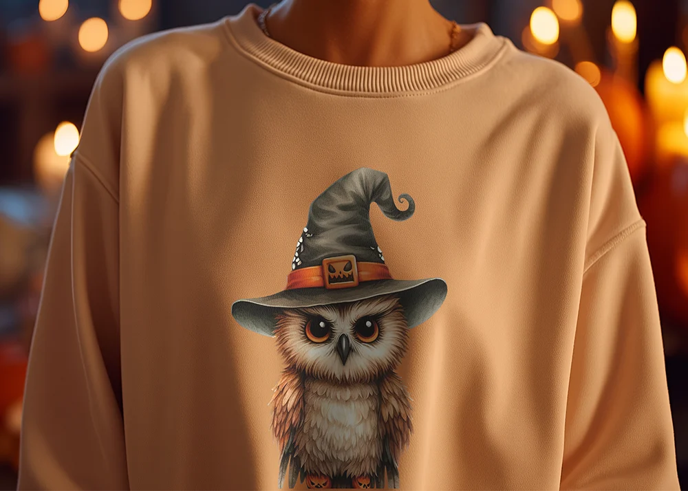 Bügelbild Hexen-Eule – realistische Eule mit Hexenhut & leuchtenden Augen für mystische Halloween-Outfits